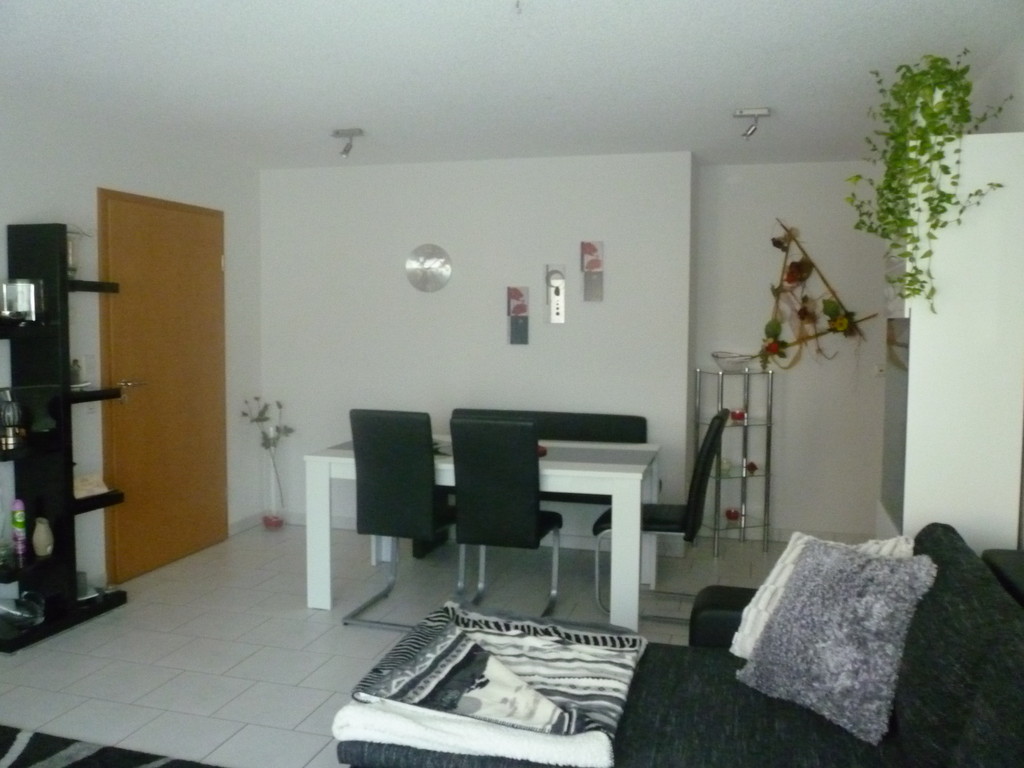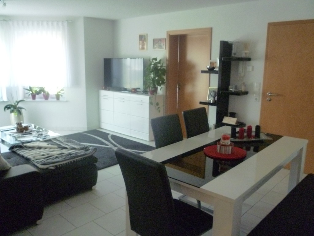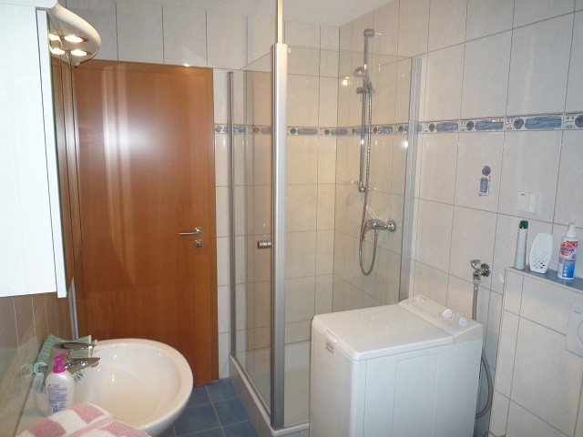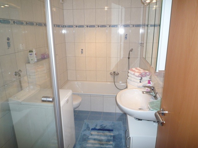 Wohnzimmer mit Essecke, Küche, Schlafzimmer, Bad mit Dusche, Wanne und WC, Terasse.
